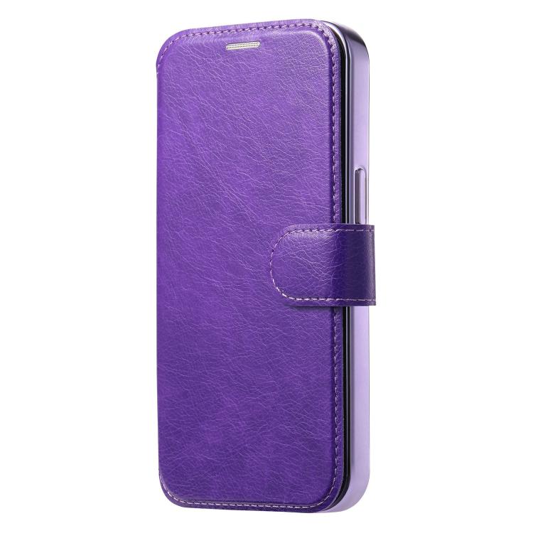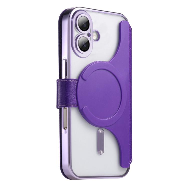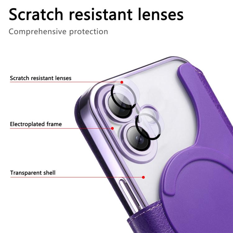 Funda de cuero antirrobo RFID MagSafe galvanizada divisible para iPhone 17 con protector de lente (morado)