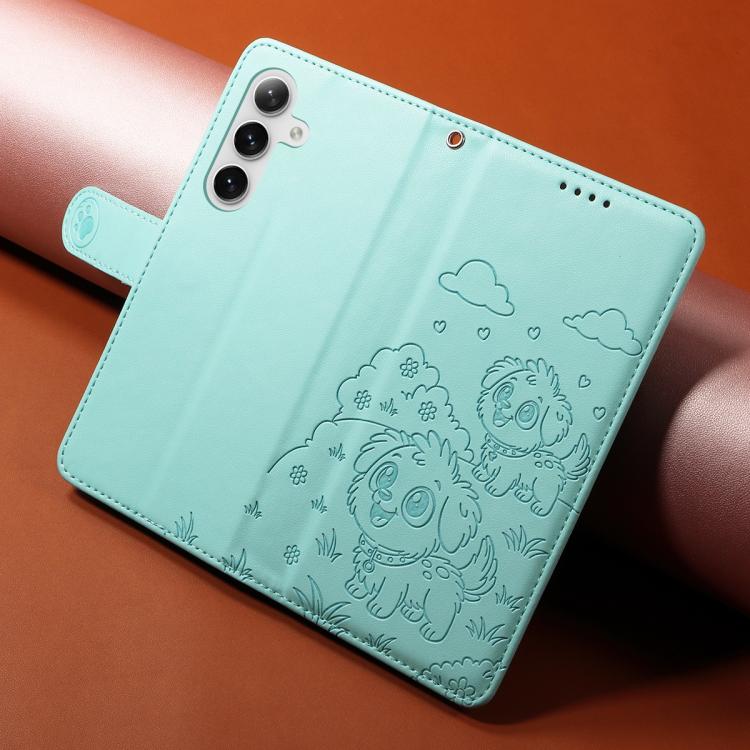 Funda de cuero con bloqueo RFID para Samsung Galaxy S24 FE 5G, diseño de corazón con perro en relieve (verde)