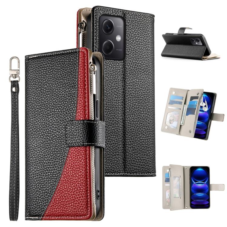 Funda de cuero con cremallera para Redmi Note 12 5G Global / Xiaomi Poco X5, con costuras, para múltiples tarjetas y correa corta (negra)
