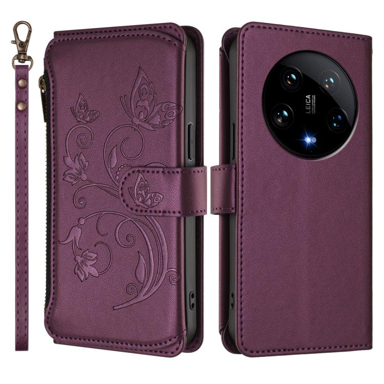 Funda de cuero con cremallera para Xiaomi 14 Ultra, diseño de mariposas y flores, con múltiples tarjetas (morado oscuro)