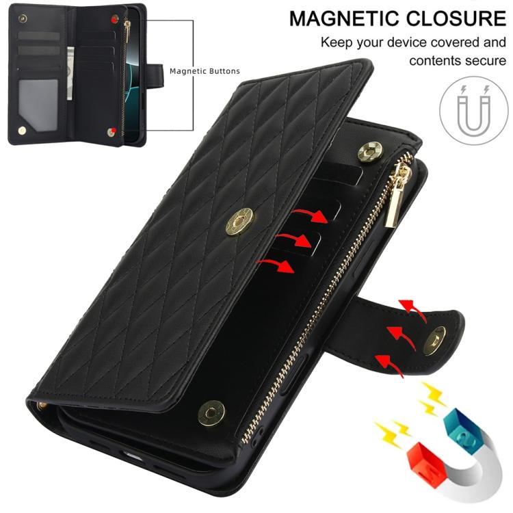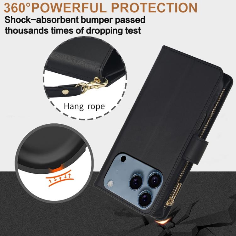 Funda de cuero con cremallera rómbica para iPhone 17 Pro YM016 con tarjetero y cordón (negra)