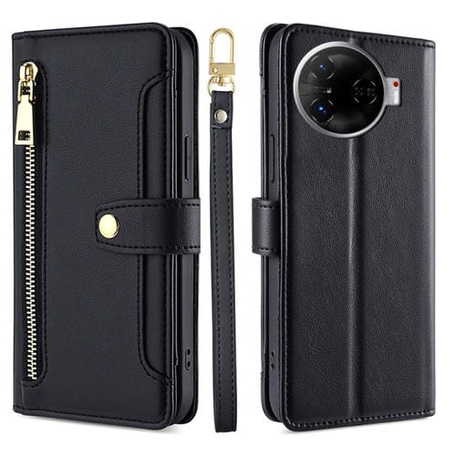 Funda de Cuero para Tecno Camon 30 Pro 5G Lite con Cremallera y Diseño de Oveja (Negro)