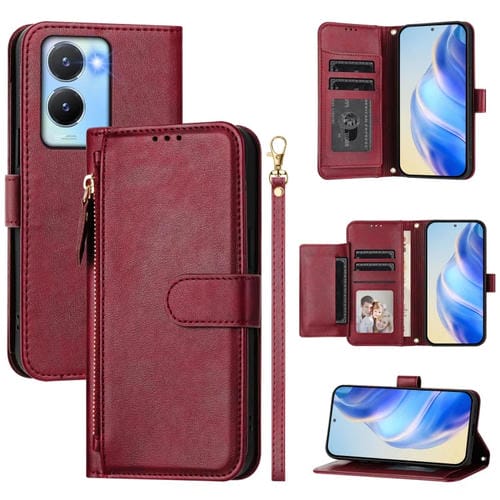 Funda de Cuero con Cremallera y Ranuras para Múltiples Tarjetas para Vivo Y56 5G / Y16 4G / Y02S 4G (Rojo Oscuro)