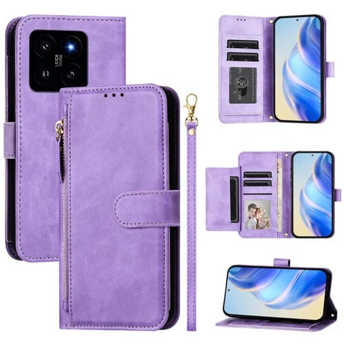 Funda de Cuero con Cremallera y Ranuras para Múltiples Tarjetas para Xiaomi 14 (Morado)