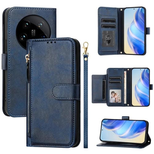 Funda de Cuero con Cremallera y Ranuras para Múltiples Tarjetas para Xiaomi 14 Ultra Global (Azul)
