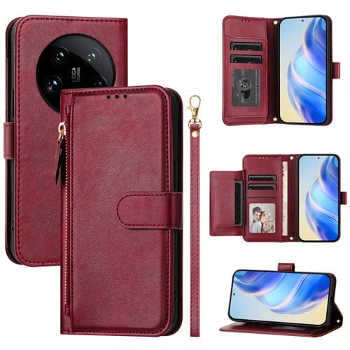 Funda de Cuero con Cremallera y Ranuras para Múltiples Tarjetas para Xiaomi 14 Ultra Global (Rojo Oscuro)