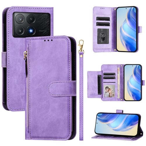 Funda de Cuero con Cremallera y Ranuras para Varias Tarjetas para Xiaomi Poco X6 Pro/Redmi K70E (Morado)