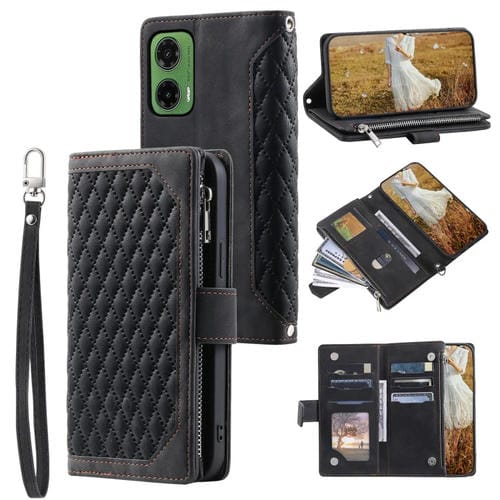 Funda de Cuero con Cremallera y Textura de Cuadrícula para Motorola Moto G35 con Cordón (Negro)