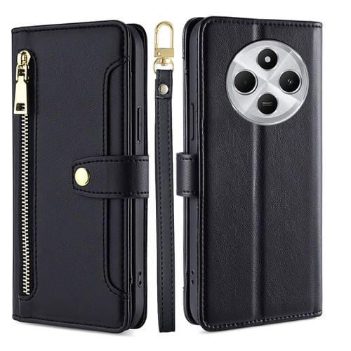 Funda de Cuero Tipo Cartera con Cremallera y Textura de Oveja para Redmi 14C 4G (Negra)