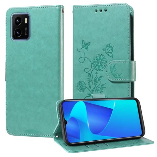 Funda de Cuero con Diseño de Mariposas y Flores En Relieve para Vivo Y15A 4G Global / Y15S 4G (Verde)