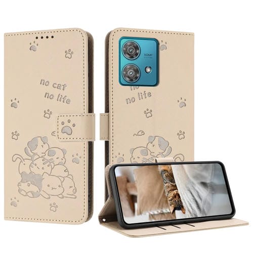 Funda de Cuero Motorola Edge 40 Neo con Diseño de Gatito En Relieve y Cordón (Beige)