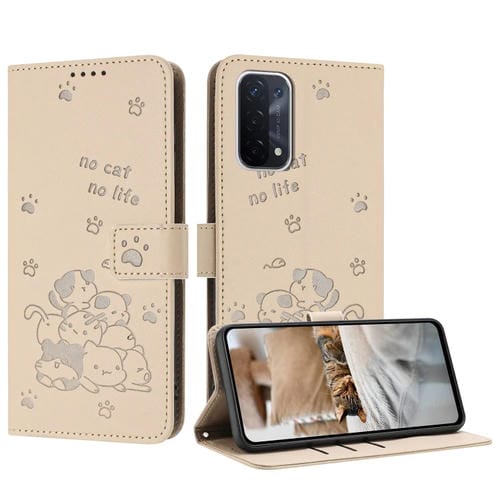 Funda de Piel con Diseño de Gatito En Relieve y Cordón para Oppo A74 5G / A93 5G (Beige)