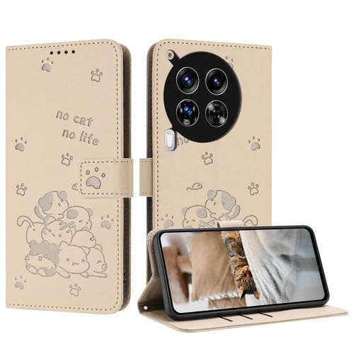 Funda de Cuero para Tecno Camon 30 4G y 5G con Diseño de Gatito En Relieve y Cordón (Beige)