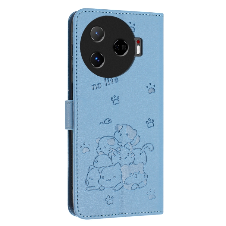 Funda de Cuero para Tecno Camon 30 Pro 5G con Diseño de Gatito en Relieve y Cordón (Azul)