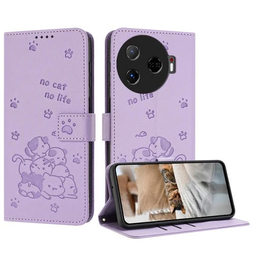 Funda de Cuero para Tecno Camon 30 Pro 5G con Diseño de Gatito En Relieve y Cordón (Morado)