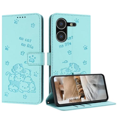 Funda de Cuero para Tecno Pova 5 con Diseño de Gatito en Relieve y Cordón (Verde Menta)