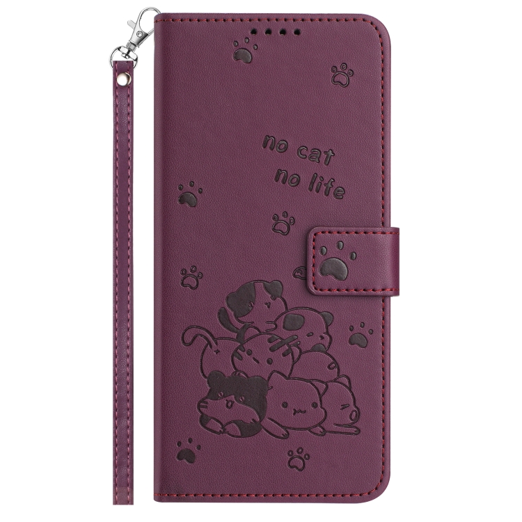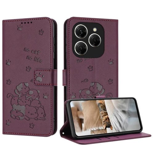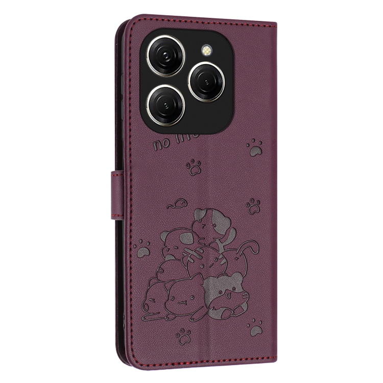 Funda de Cuero para Tecno Spark 20 Pro 5G con Diseño de Gatito en Relieve y Cordón (Rojo Vino)