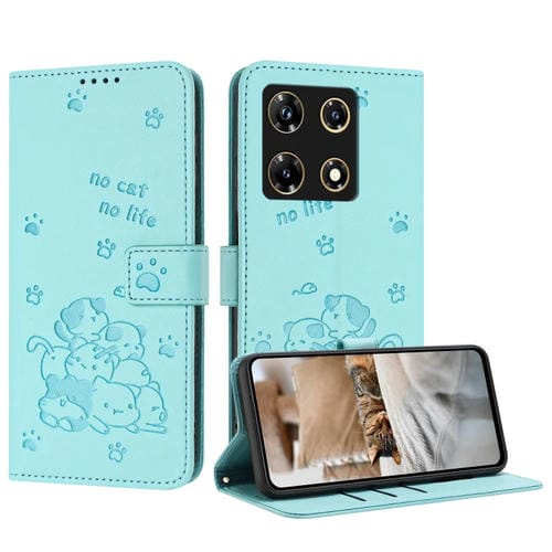 Funda de Cuero Infinix Note 30 Pro con Diseño de Gatito en Relieve y Cordón (Verde Menta)