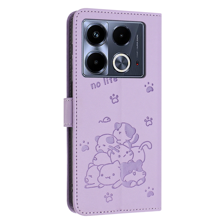 Funda de Cuero Infinix Note 40 5G con Diseño de Gatito en Relieve y Cordón (Morado)