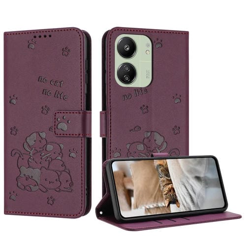 Funda de Piel con Diseño de Gatito En Relieve y Cordón para Xiaomi Poco C65/Poco M6 5G (Rojo Vino)