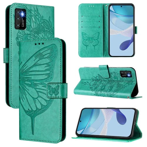 Funda de Cuero para Cubot P50 con Diseño de Mariposa en Relieve (Verde)