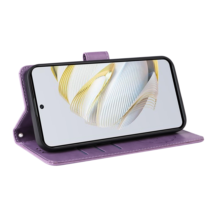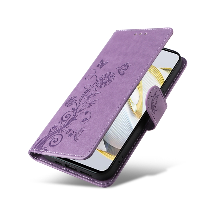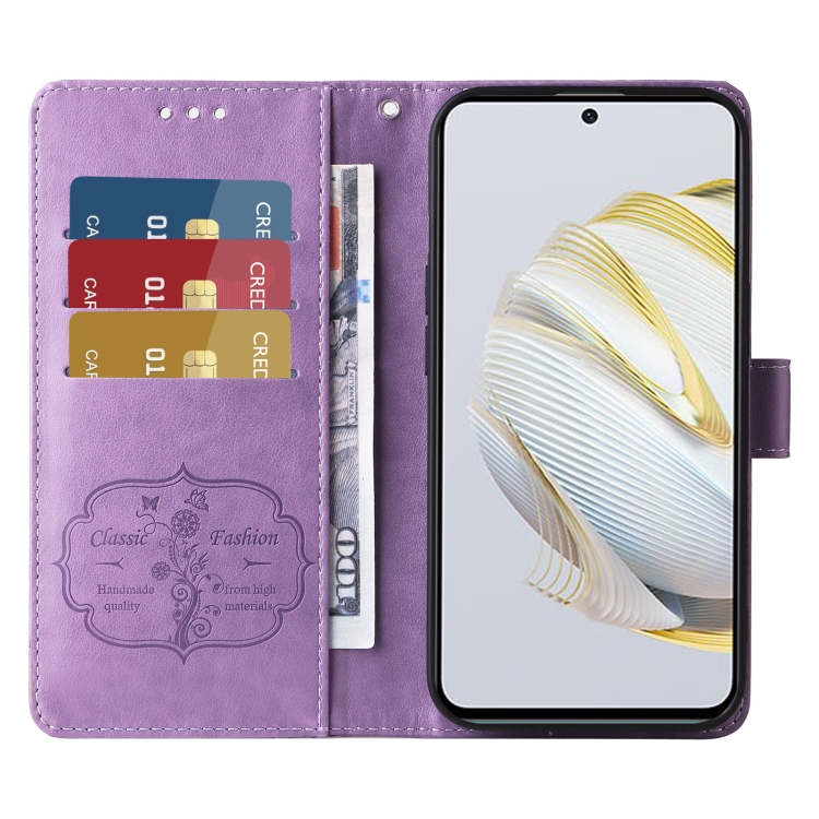 Funda de Cuero para Huawei Nova 10 Se con Diseño de Mariposas y Flores en Relieve (Morado)