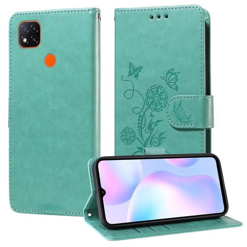 Funda de Cuero con Diseño de Mariposas y Flores En Relieve para Redmi 10A 4G (Verde)