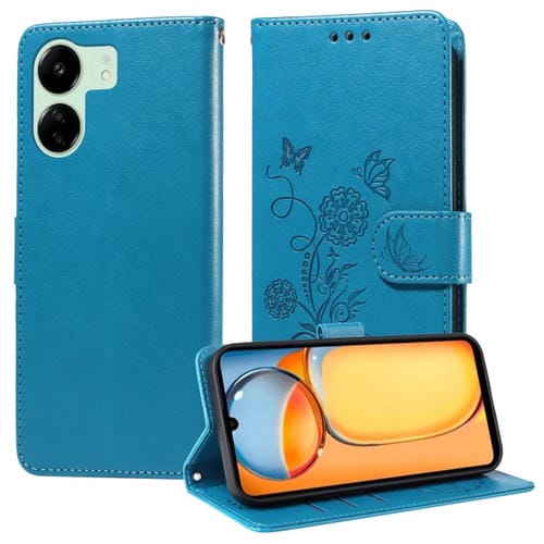 Funda de Cuero con Diseño de Mariposas y Flores En Relieve para Redmi 13C 5G/4G/13R (Azul)