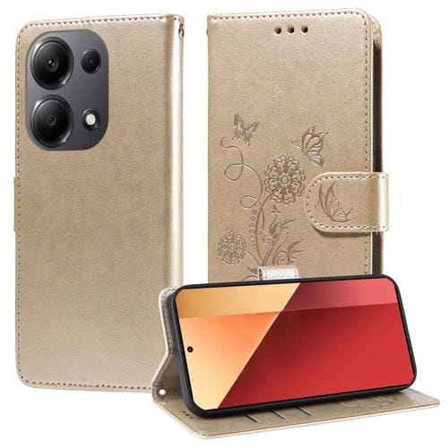 Funda de Cuero con Diseño de Mariposas y Flores En Relieve para Redmi Note 13 Pro 4G (Dorada)