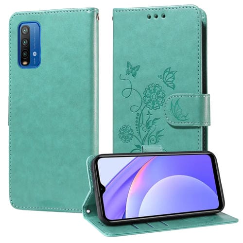 Funda de Cuero con Diseño de Mariposas y Flores En Relieve para Redmi Note 9 4G/10X 4G (Verde)