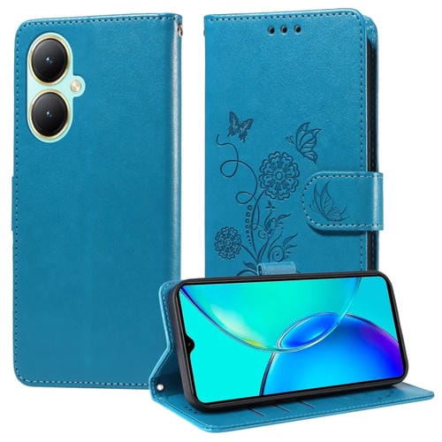Funda de Cuero con Diseño de Mariposas y Flores En Relieve para Vivo Y35M+ / Y35+ / Y27 4G (Azul)