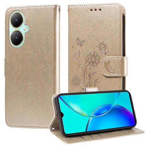 Funda de Cuero con Diseño de Mariposas y Flores En Relieve para Vivo Y35M+ / Y35+ / Y27 4G (Dorada)
