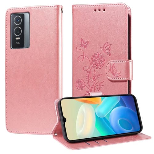 Funda de Cuero con Diseño de Mariposas y Flores En Relieve para Vivo Y76 5G/Y76S (Oro Rosa)