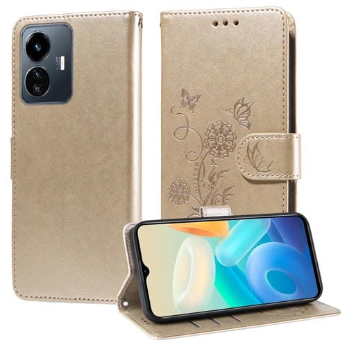 Funda de Cuero con Diseño de Mariposas y Flores En Relieve para Vivo Y77 5G (Dorada)