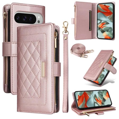 Funda de Cuero con Diseño de Rombos y Billetera Cruzada con Cremallera para Google Pixel 9 Pro XL (Oro Rosa)