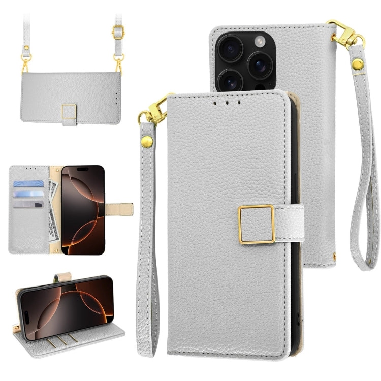 Funda de Cuero para iPhone 16 Pro con Hebilla Cuadrada y Textura de Lichi (Plateada)