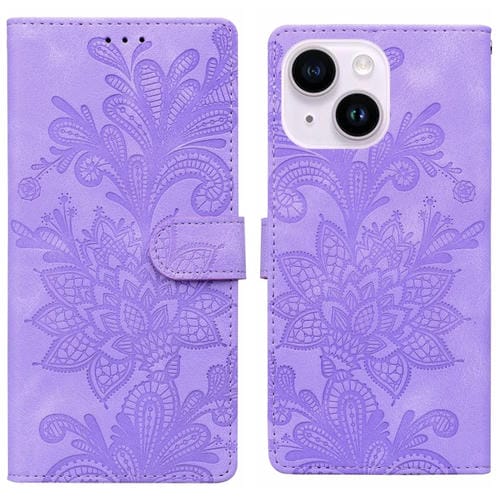 Funda de Cuero con Hebilla Magnética y Diseño Floral En Relieve para iPhone 14 Plus/15 Plus (Morado)