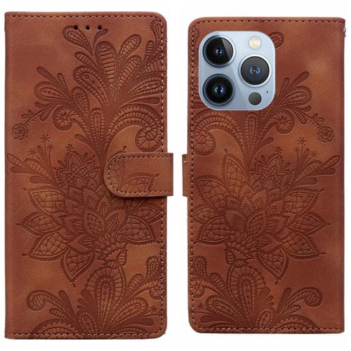 Funda de Cuero con Hebilla Magnética y Diseño Floral En Relieve para iPhone 14 Pro Max (Marrón)