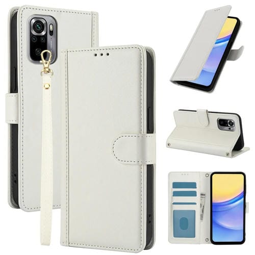 Funda de Cuero con Ranuras para Tarjetas y Diseño de Piel Sintética de Color Puro para Redmi Note 10 4G/Note 10S 4G con Cordón Doble (Blanco)