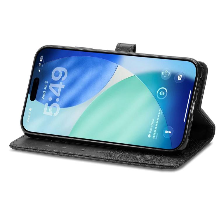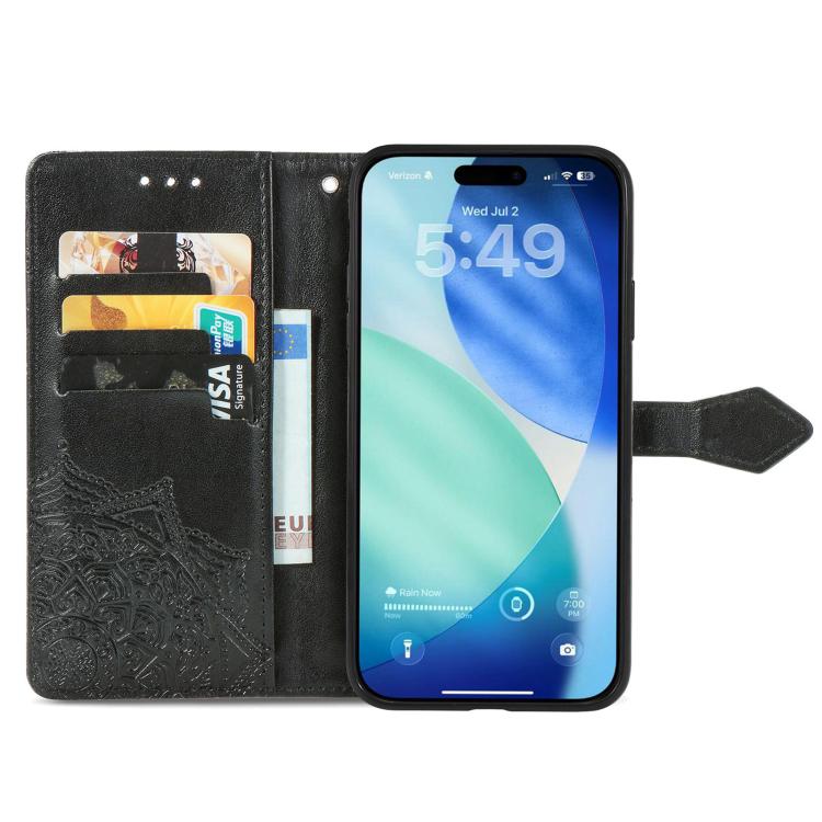 Funda de cuero con relieve de flor de mandala para iPhone 17 Pro (negra)