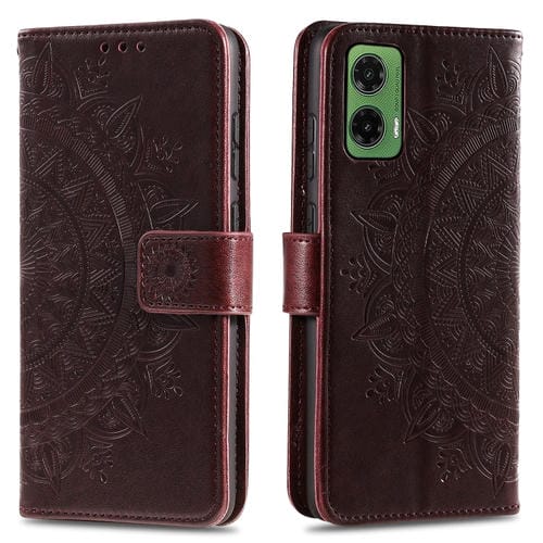 Funda de Cuero con Relieve de Flores para Motorola Moto G35 con Cordón (Marrón)
