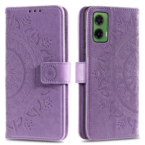 Funda de Cuero con Relieve de Flores y Tótem para Motorola Moto G35 con Cordón (Morado)