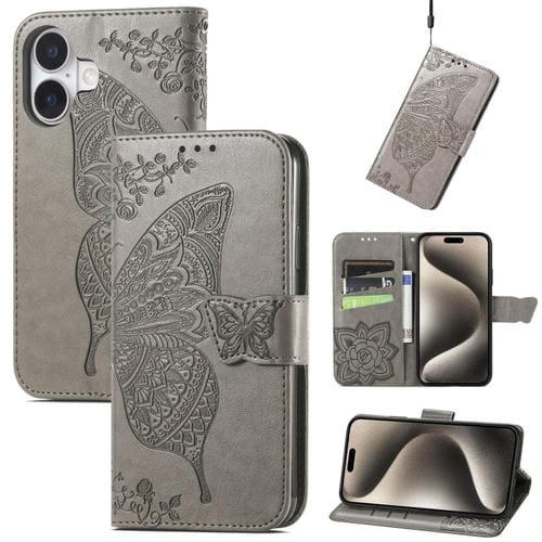 Funda de Cuero con Relieve de Mariposa y Flor para iPhone 16 Plus (Gris)
