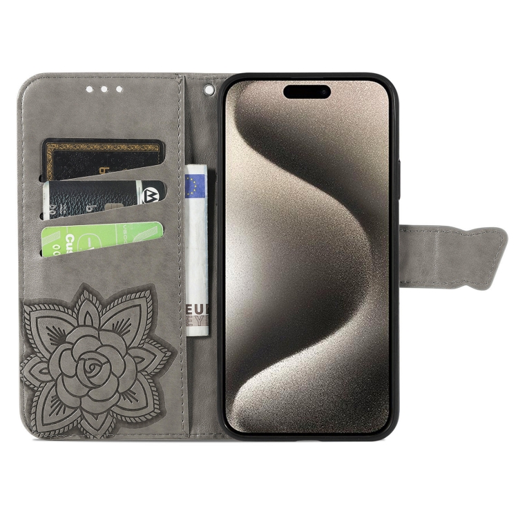 Funda de Cuero con Relieve de Mariposa y Flor para iPhone 16 Pro Max (Gris)