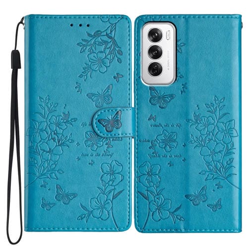 Funda de Cuero con Relieve de Mariposa y Flor para Oppo Reno12 Pro 5G Global (Azul)