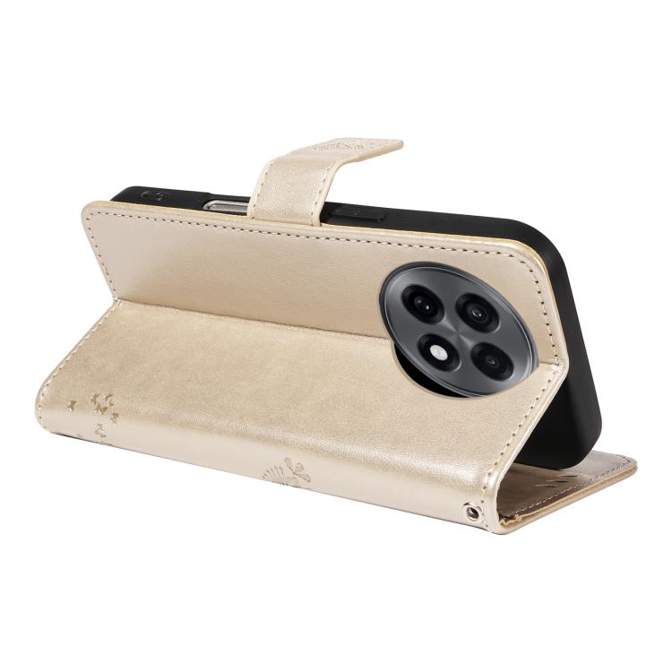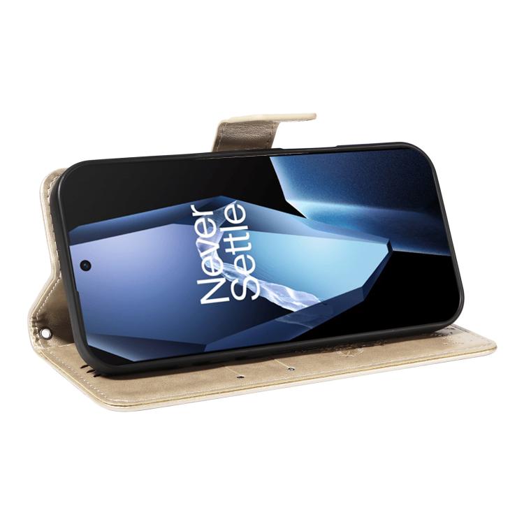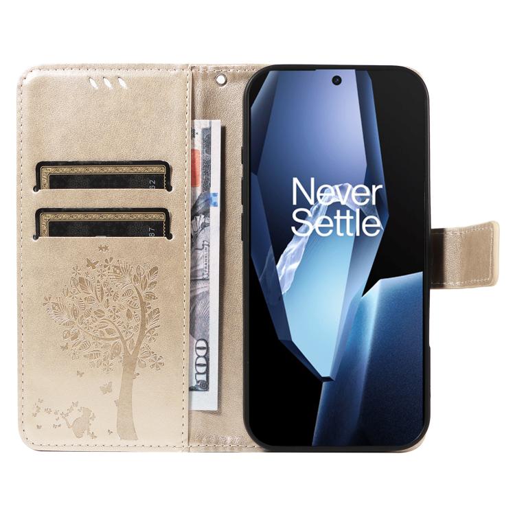 Funda de Cuero con Tapa para OnePlus 13R Global con Patrón En Relieve Árbol y Gato (Dorada)