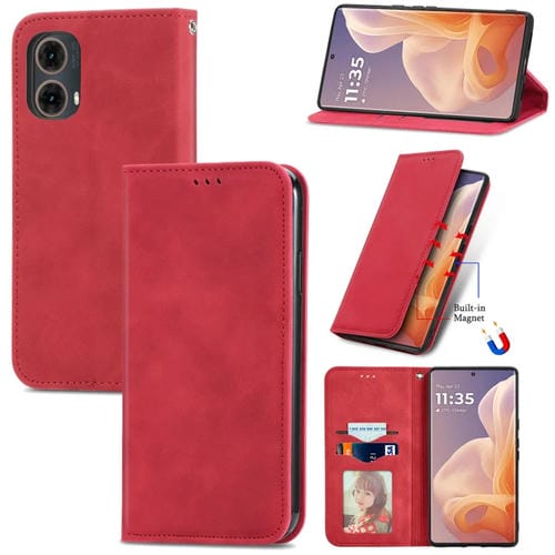 Funda de Cuero con Tapa Magnética y Tacto Retro para Motorola Moto G45 (Rojo)