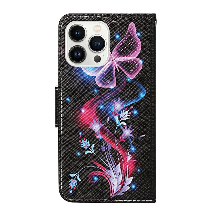 Funda de Cuero con Tapa para iPhone 16 Pro con Dibujo en Color 3D (Mariposa Fluorescente)