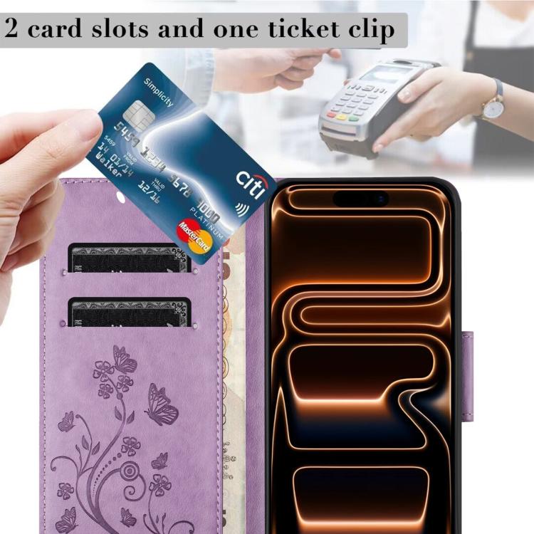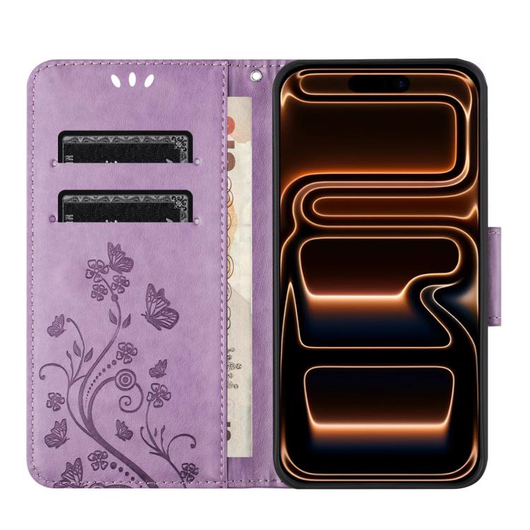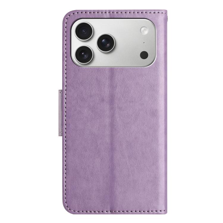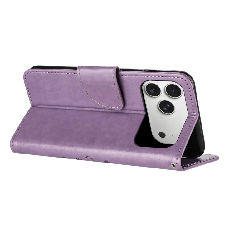 Funda de cuero con tapa para iPhone 17 Pro Max con diseño de mariposas y flores (morado claro)
