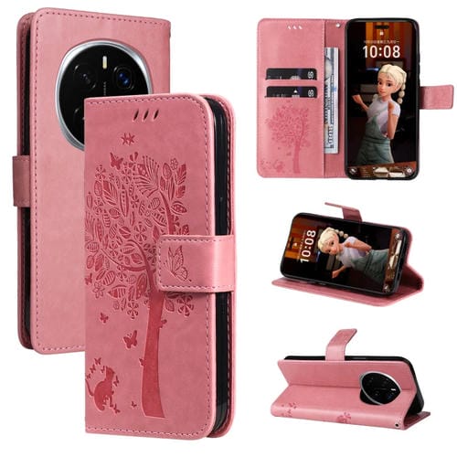 Funda de Cuero con Tapa para Honor Magic7 Pro con Diseño de Árbol y Gato en Relieve (Rosa)